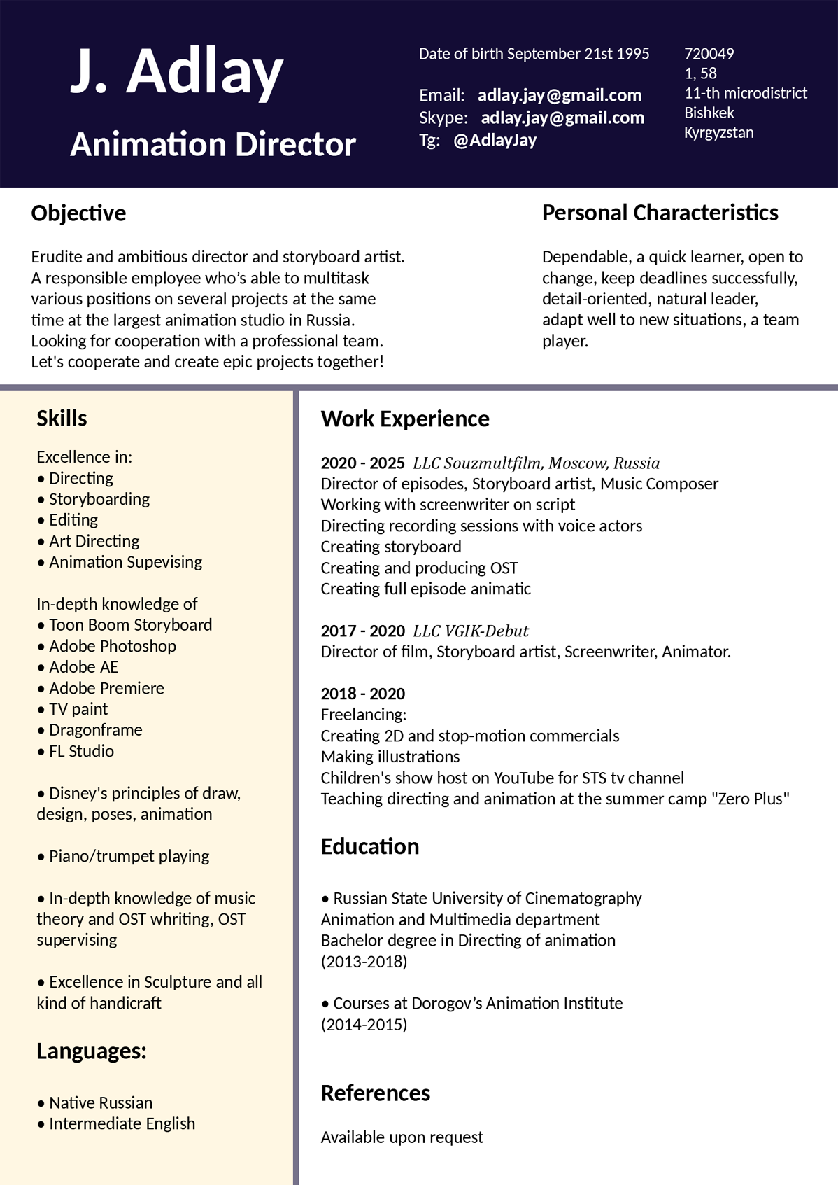 I graduated in 2018 and since then I have been working in the field of animation in a variety of positions, from director to music composer.